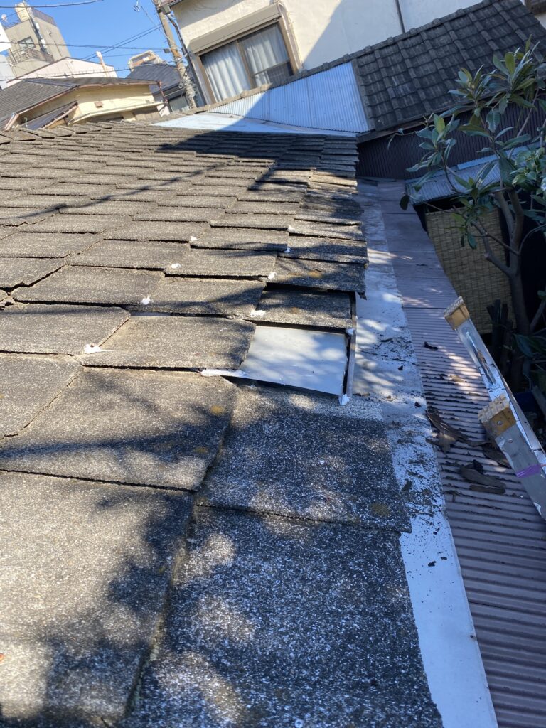 下地が腐って瓦を綺麗に並べることができないので今回はできる限り雨漏りがしないようにしました。瓦止めと板金差し込みのみ。普通の雨ならある程度大丈夫ですが雨風が強いと雨漏りがしそうです。本来なら屋根の葺き替え工事が必要な状態です。